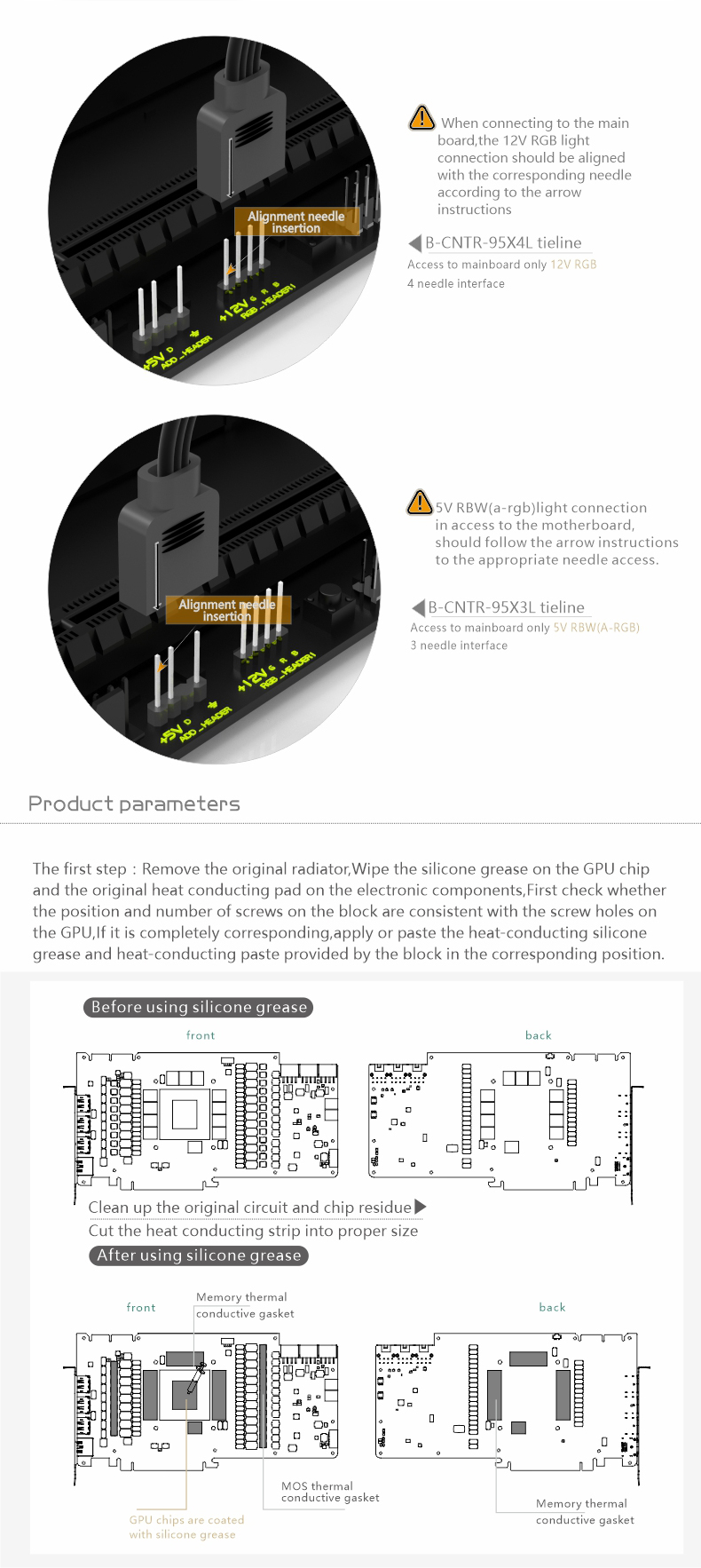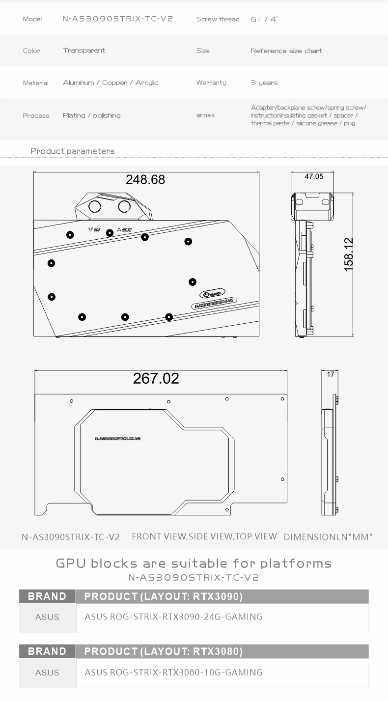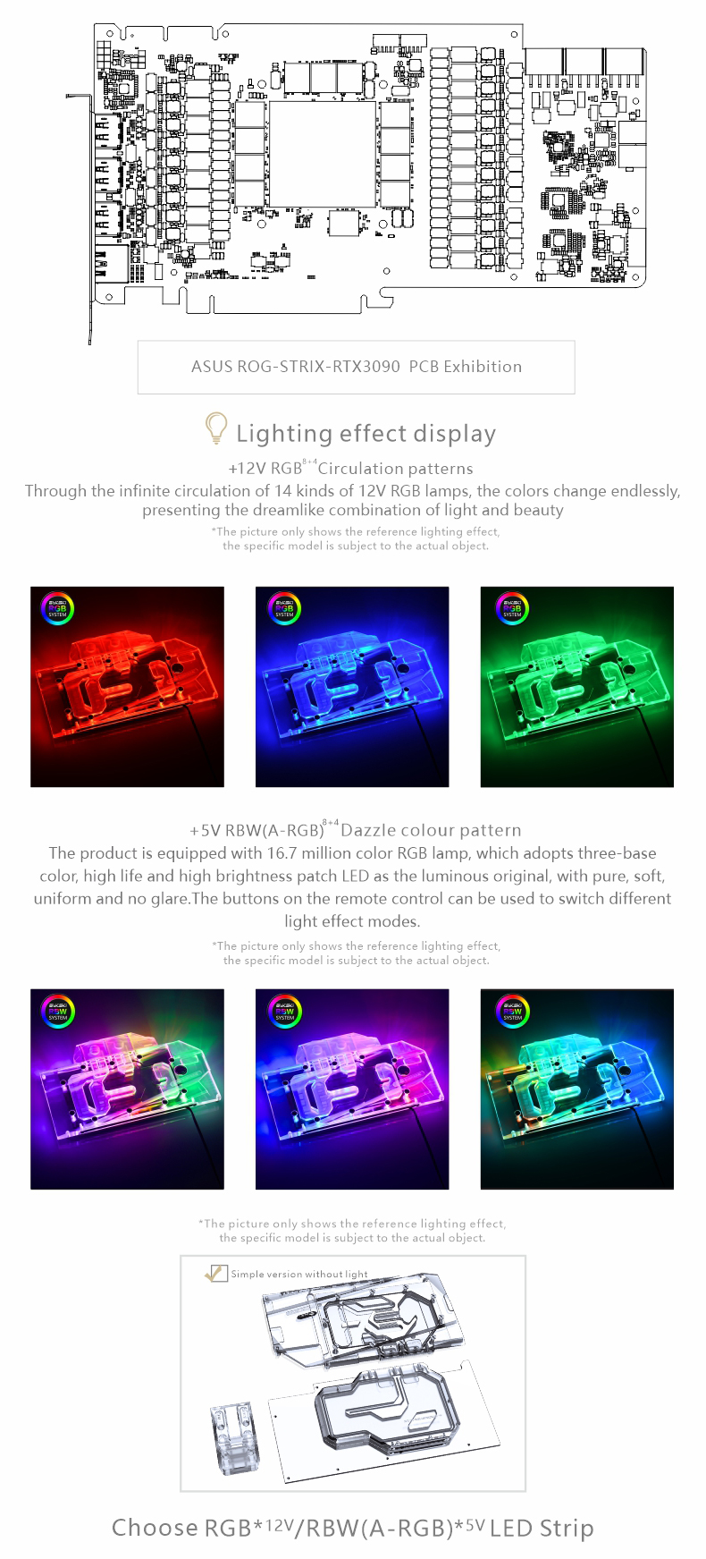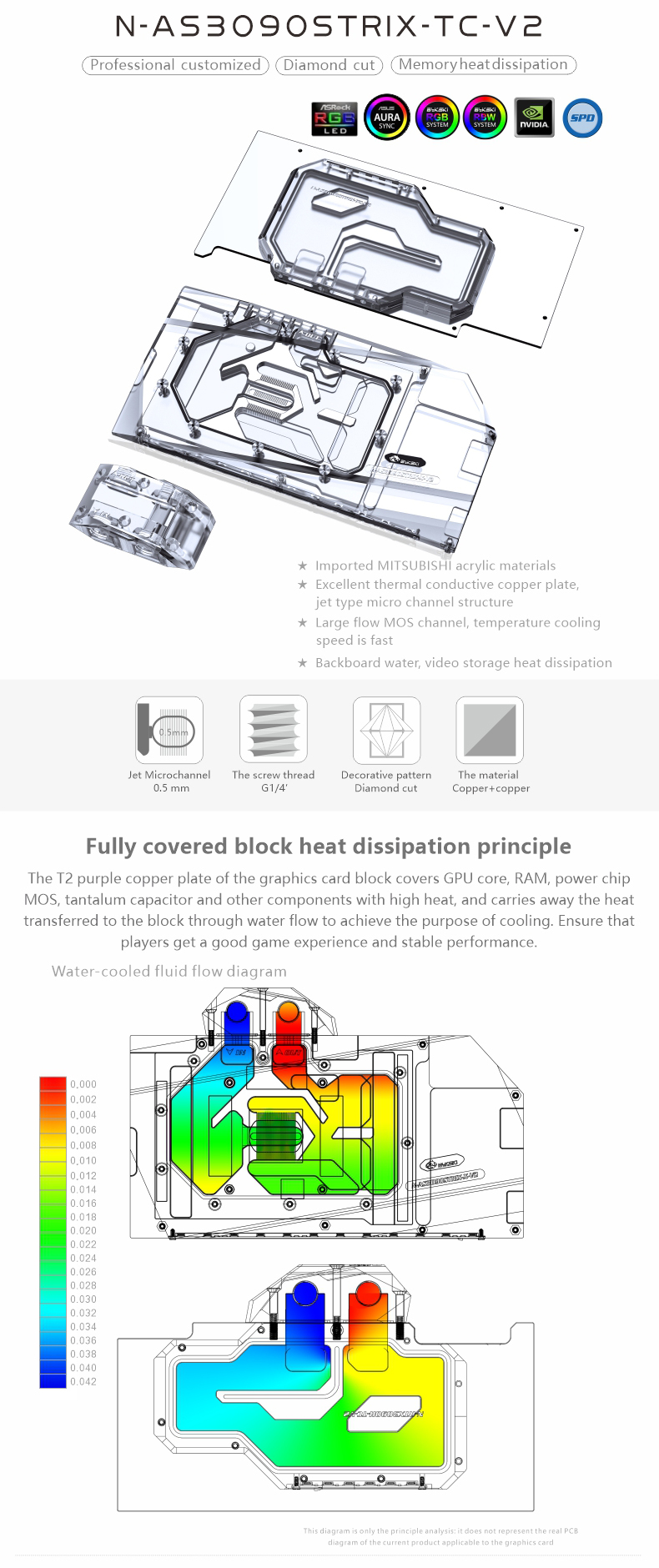 2021 New design for high power gpu, Both sides of the water cooling, cooling more efficient, suitable for high-power GPU, lower temperature, more stable, more ETH.Compatible list, including but not limited to the following models, PCB is used as the basis to judge whether it is compatible. If you have any questions, please contact me before purchasing.ASUS ROG Strix RTX 3090ASUS ROG Strix RTX 3080