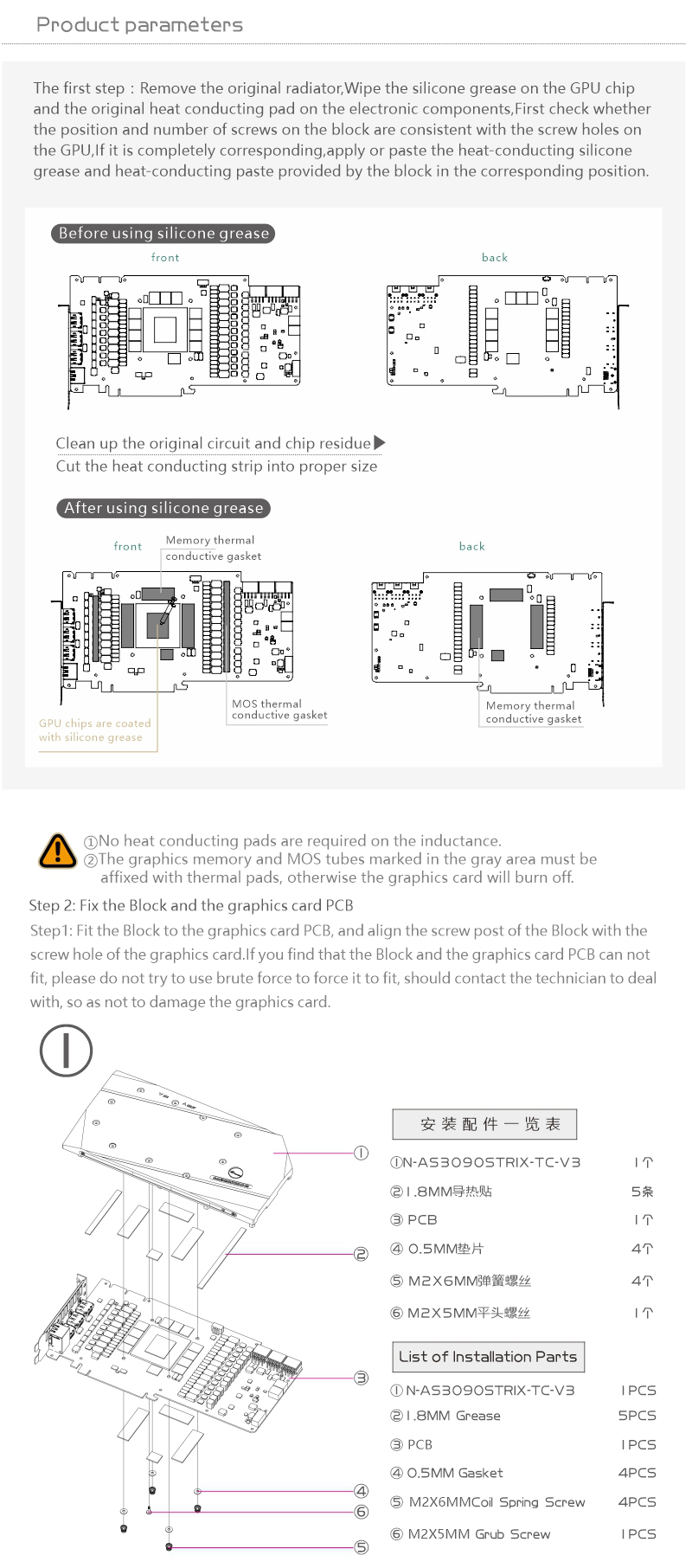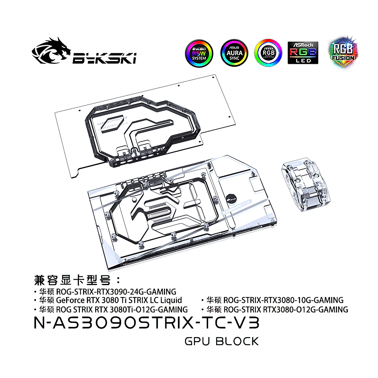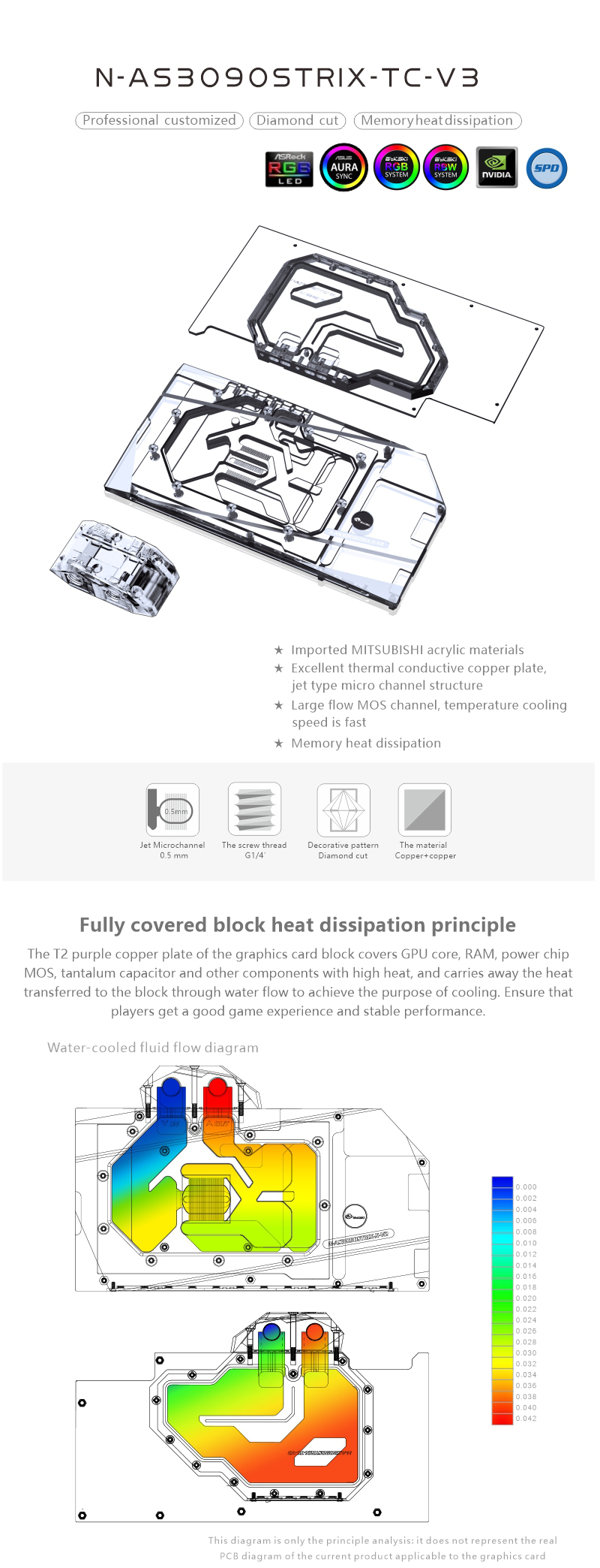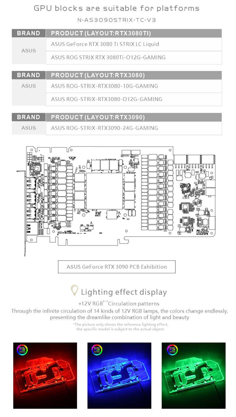 2021 New design for high power gpu, Both sides of the water cooling, cooling more efficient, suitable for high-power GPU, lower temperature, more stable, more ETH.Compatible list, including but not limited to the following models, PCB is used as the basis to judge whether it is compatible. If you have any questions, please contact me before purchasing.ASUS ROG Strix RTX 3090ASUS ROG Strix RTX 3080Ti Strix LC LiquidASUS ROG Strix RTX 3080Ti Strix O12GASUS ROG Strix RTX 3080 Strix O12GASUS ROG Strix RTX 3080 Strix 10G