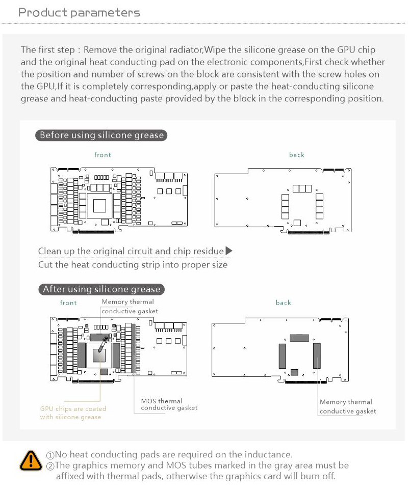 Please judge whether the block can be applied to your graphics card according to the PCB, the position of the Core/VRAM/Capacitor/Inductor/Screw hole must be 100% compliant, the number of VRAM/Capacitor/Inductors may vary slightly depending on the card model.
