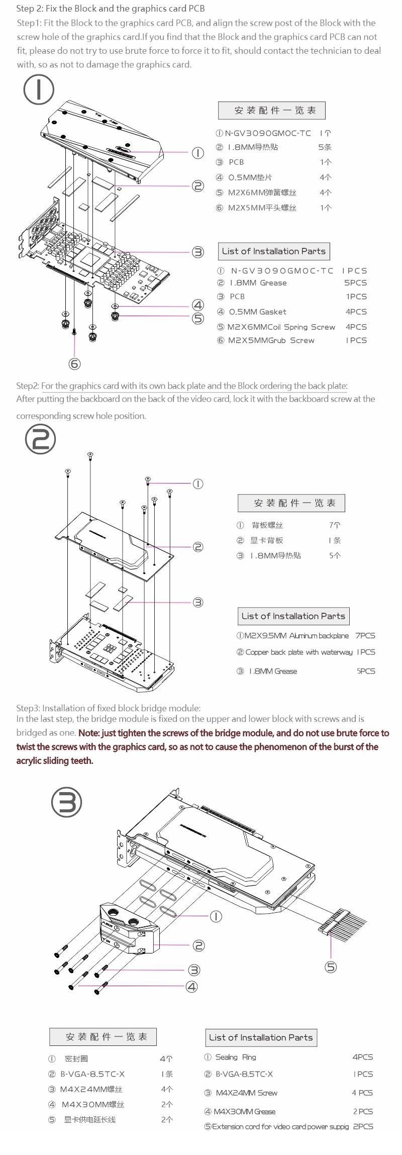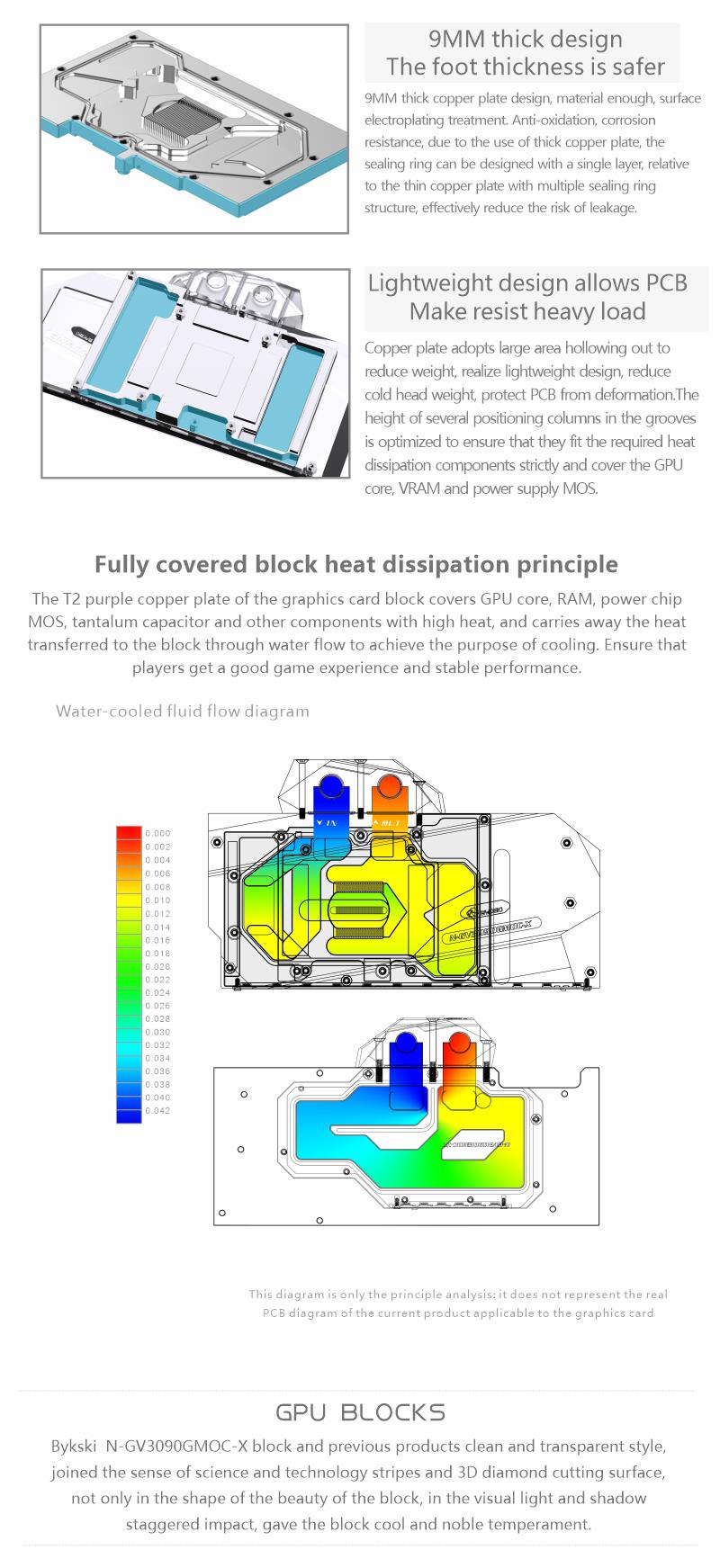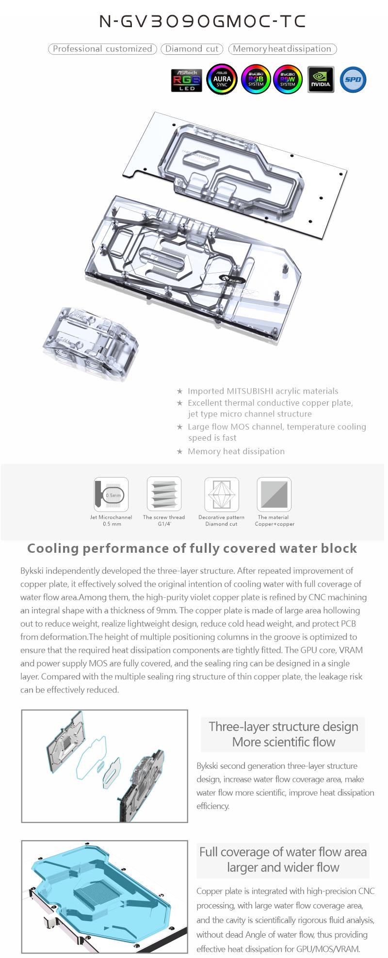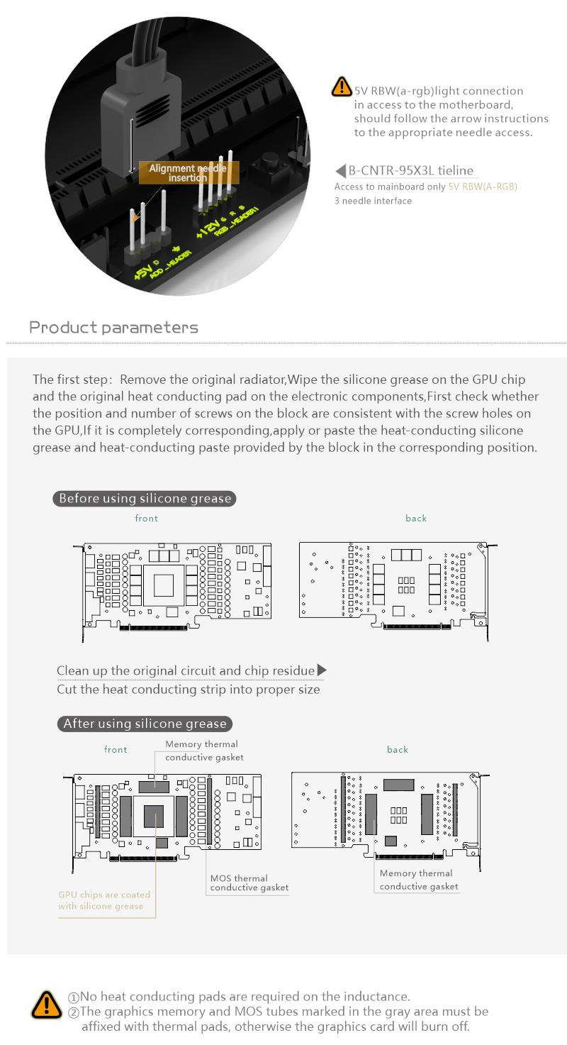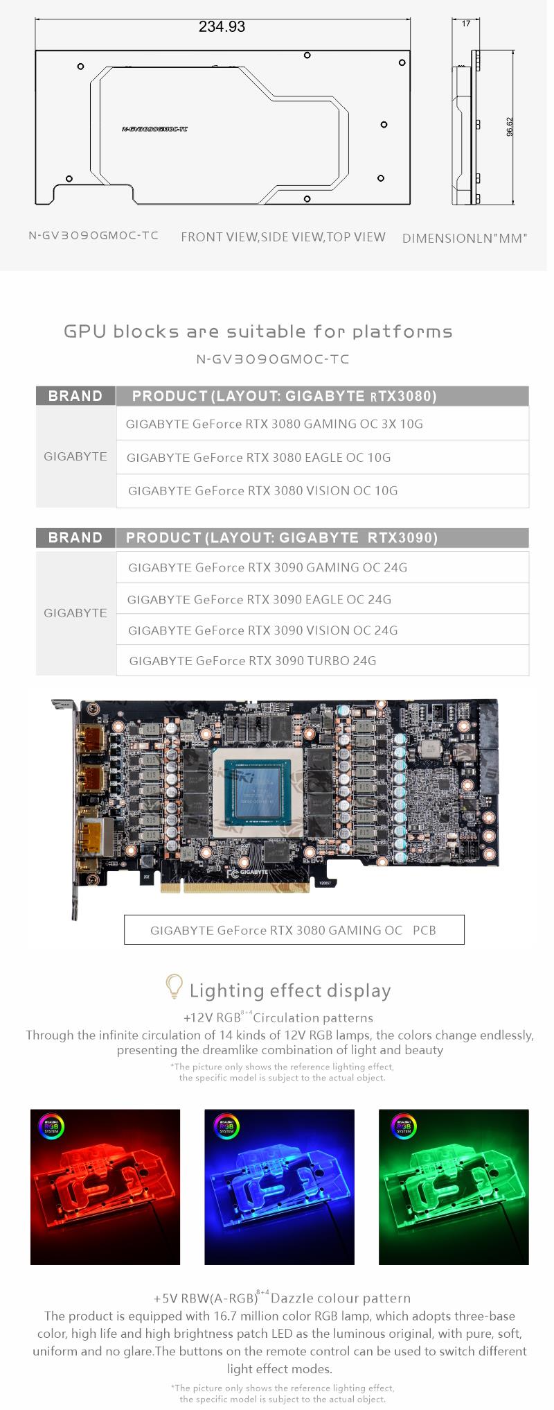 2021 New design for high power gpu, Both sides of the water cooling, cooling more efficient, suitable for high-power GPU, lower temperature, more stable, more ETH.Compatible List (Including but not limited to the following models)GigaByte RTX 3080 Gaming OC 3X 10GGigaByte RTX 3080 EAGLE OC 10GGigaByte RTX 3080 VISION OC 10GGigaByte RTX 3090 Gaming OC 3X 24GGigaByte RTX 3090 EAGLE OC 24GGigaByte RTX 3090 VISION OC 24GThe following are some compatible graphics cards and PCB photos, for reference only, if you can not determine the compatibility, please consult us before purchase