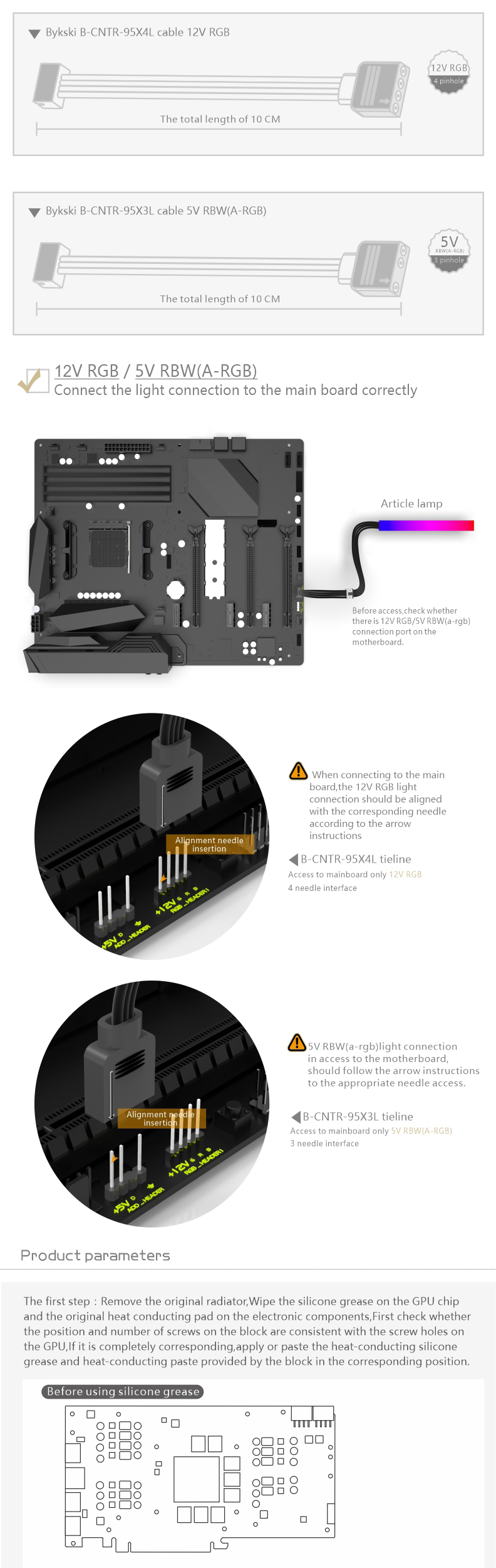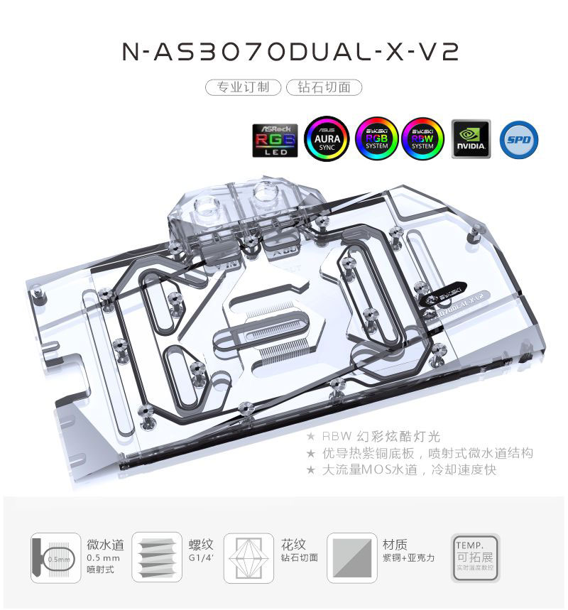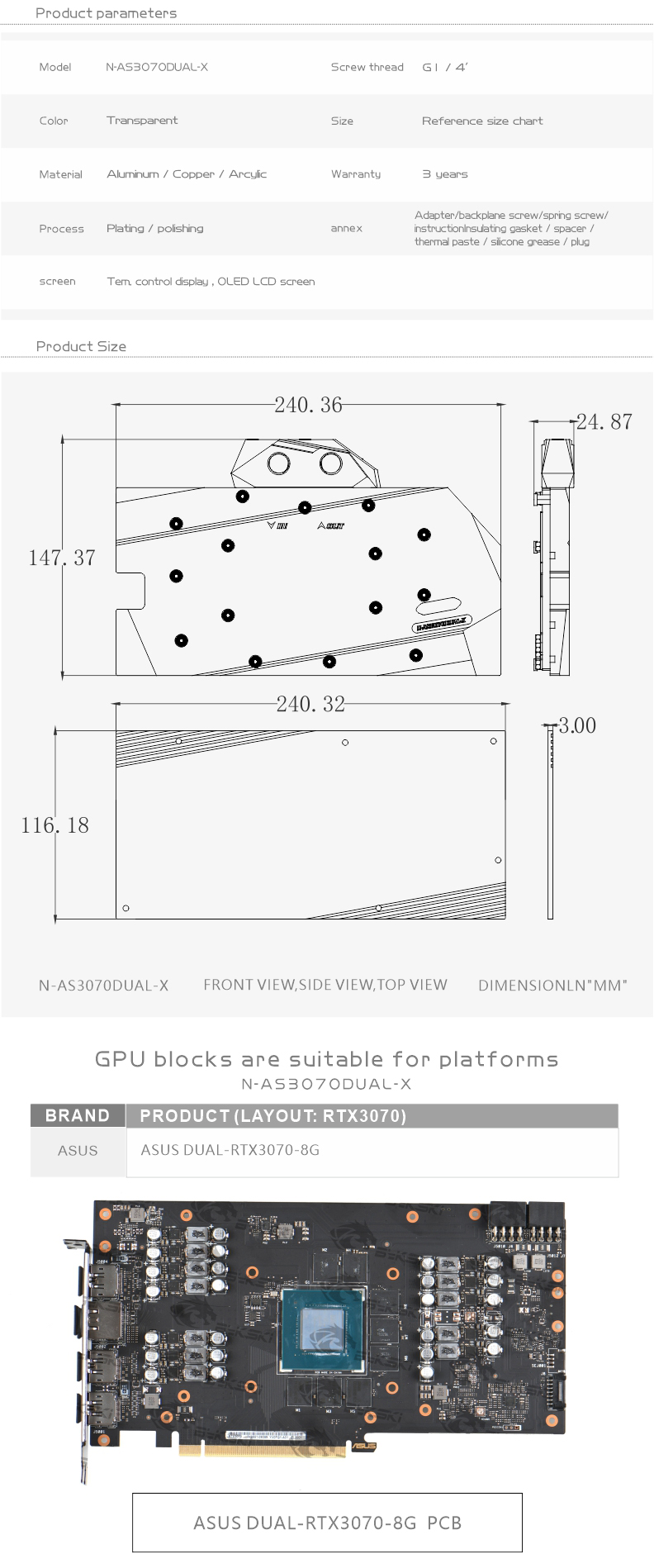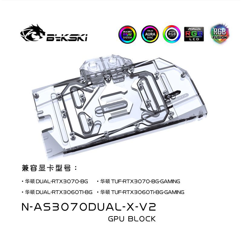 Compatible List (Including but not limited to the following models)ASUS Dual RTX3060TiASUS Dual RTX3070ASUS TUF RTX3070 GAMINGASUS TUF RTX3060Ti GAMING5v RGB included, if need 12v RGB, contact me after purchase.Backplate included.The following are some compatible graphics cards and PCB photos, for reference only, if you can not determine the compatibility, please consult us before purchase.