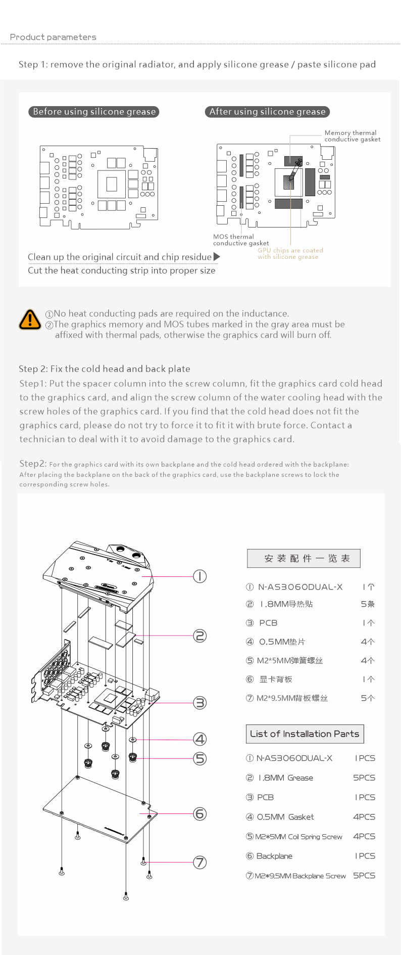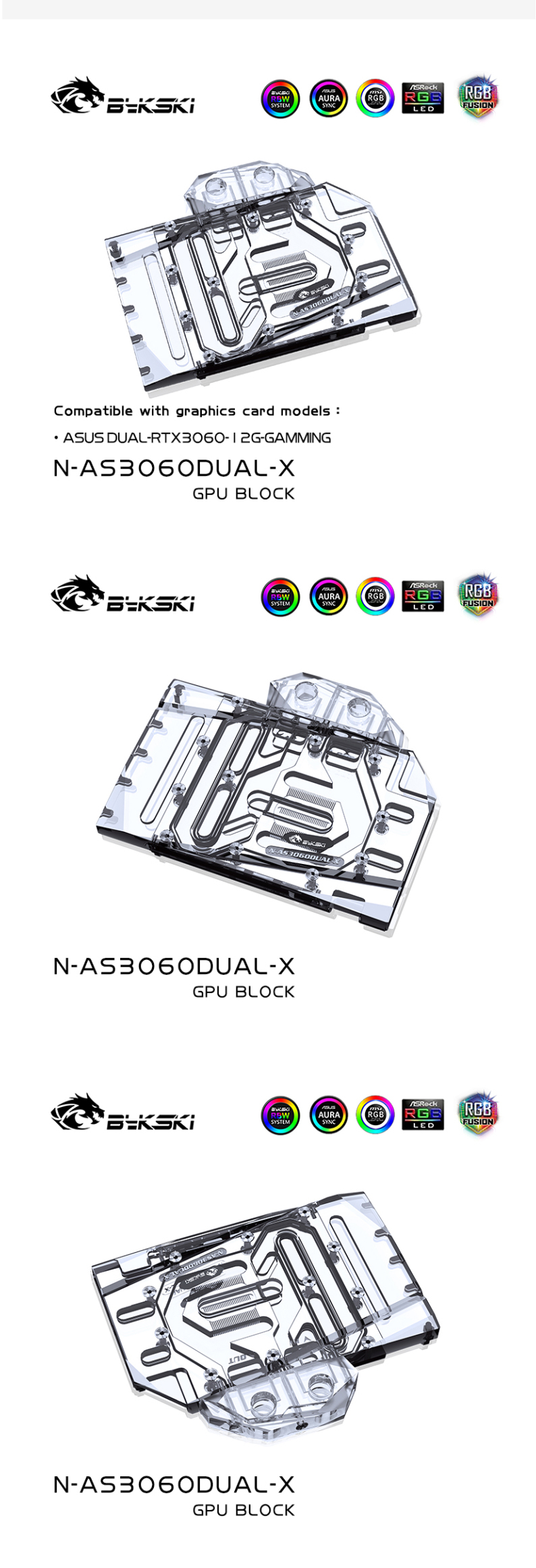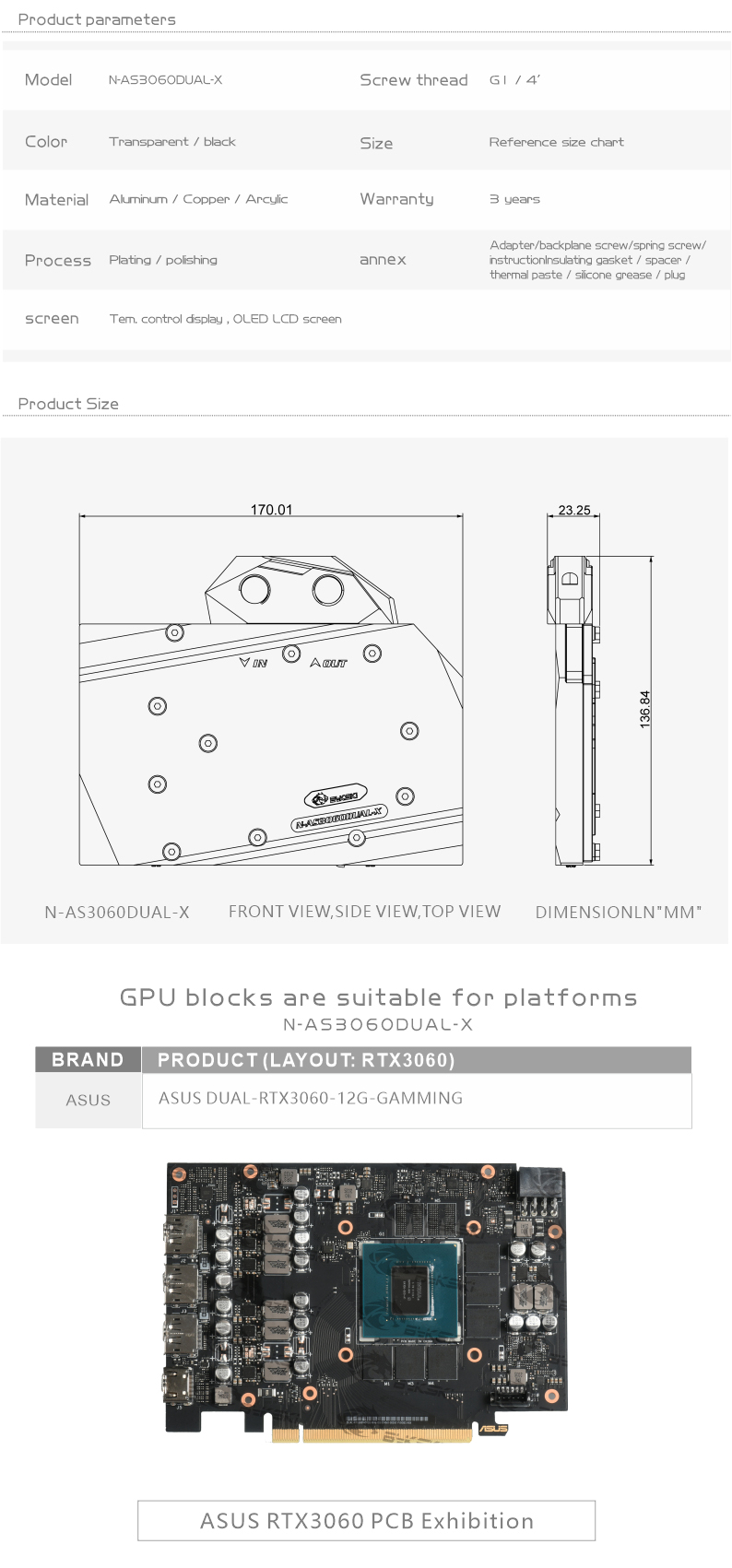 Compatible List (Including but not limited to the following models)ASUS Dual RTX3060 12GASUS Dual RTX3060Ti V2 MiniASUS Dual RTX3060 O12GThe following are some compatible graphics cards and PCB photos, for reference only, if you can not determine the compatibility, please consult us before purchase.