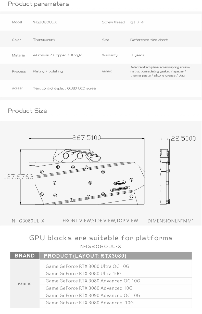 Compatible List (Including but not limited to the following models)Colorful iGame RTX 3080 Ultra OC 10GColorful iGame RTX 3080 Ultra 10GColorful iGame RTX 3080 Advanced OC 10GColorful iGame RTX 3080 Advanced 10GColorful iGame RTX 3090 Advanced OC 24G
