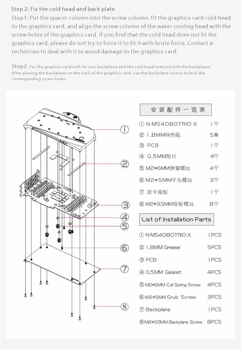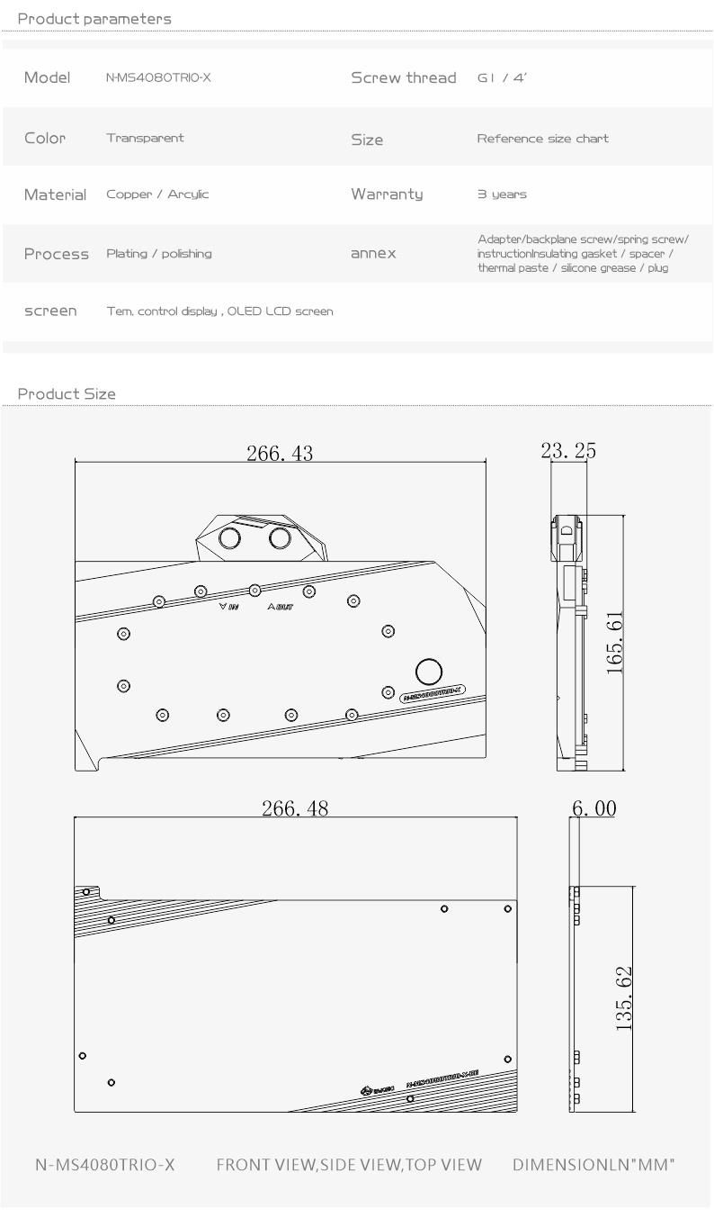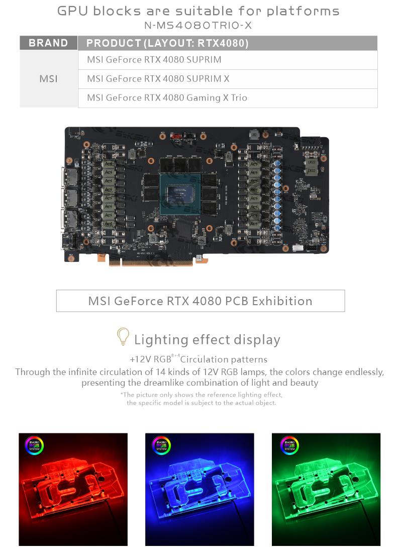 Compatible List (Including but not limited to the following models)MSI RTX4080 GAMING X TrioMSI RTX4080 SUPRIMMSI RTX4080 SUPRIM XMSI RTX4080 SUPRIM Liquid XThe following are some compatible graphics cards and PCB photos, for reference only, if you can not determine the compatibility, please consult us before purchase.