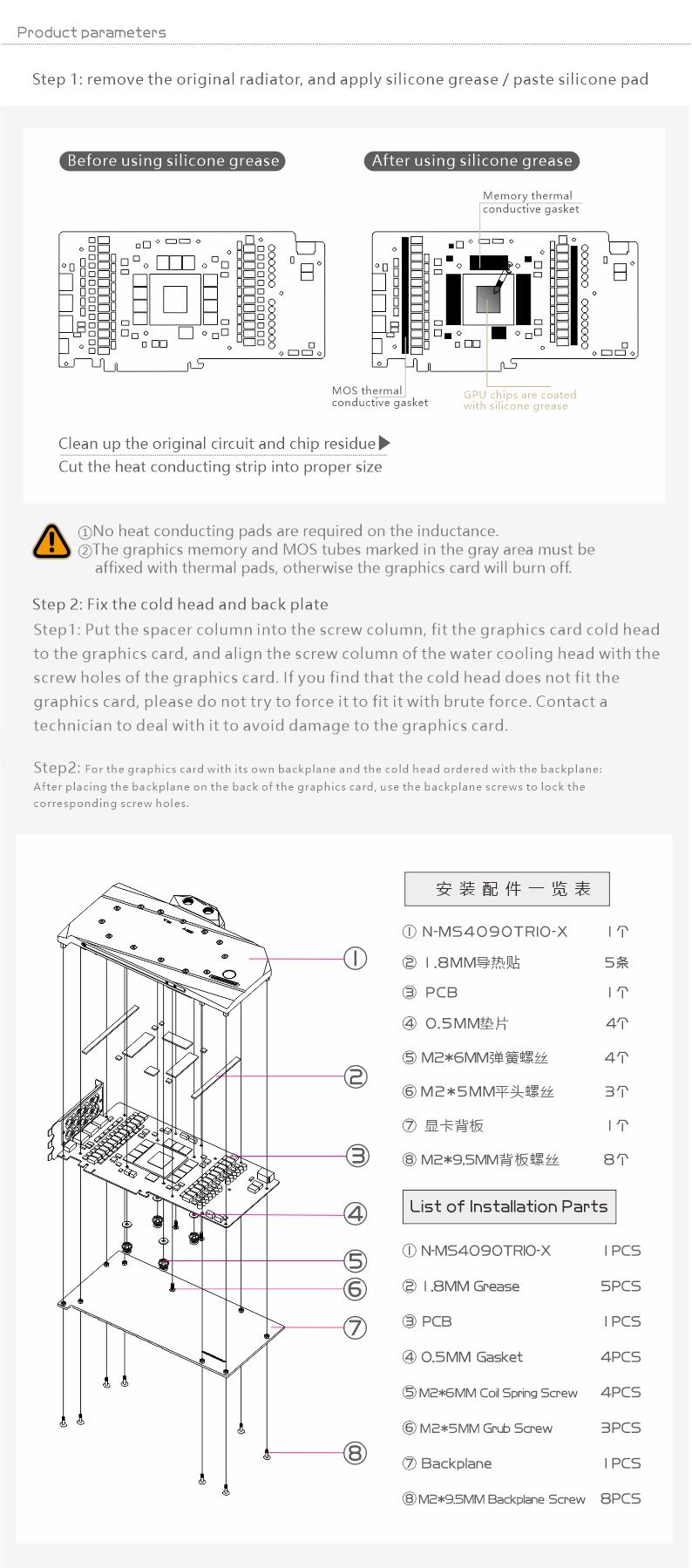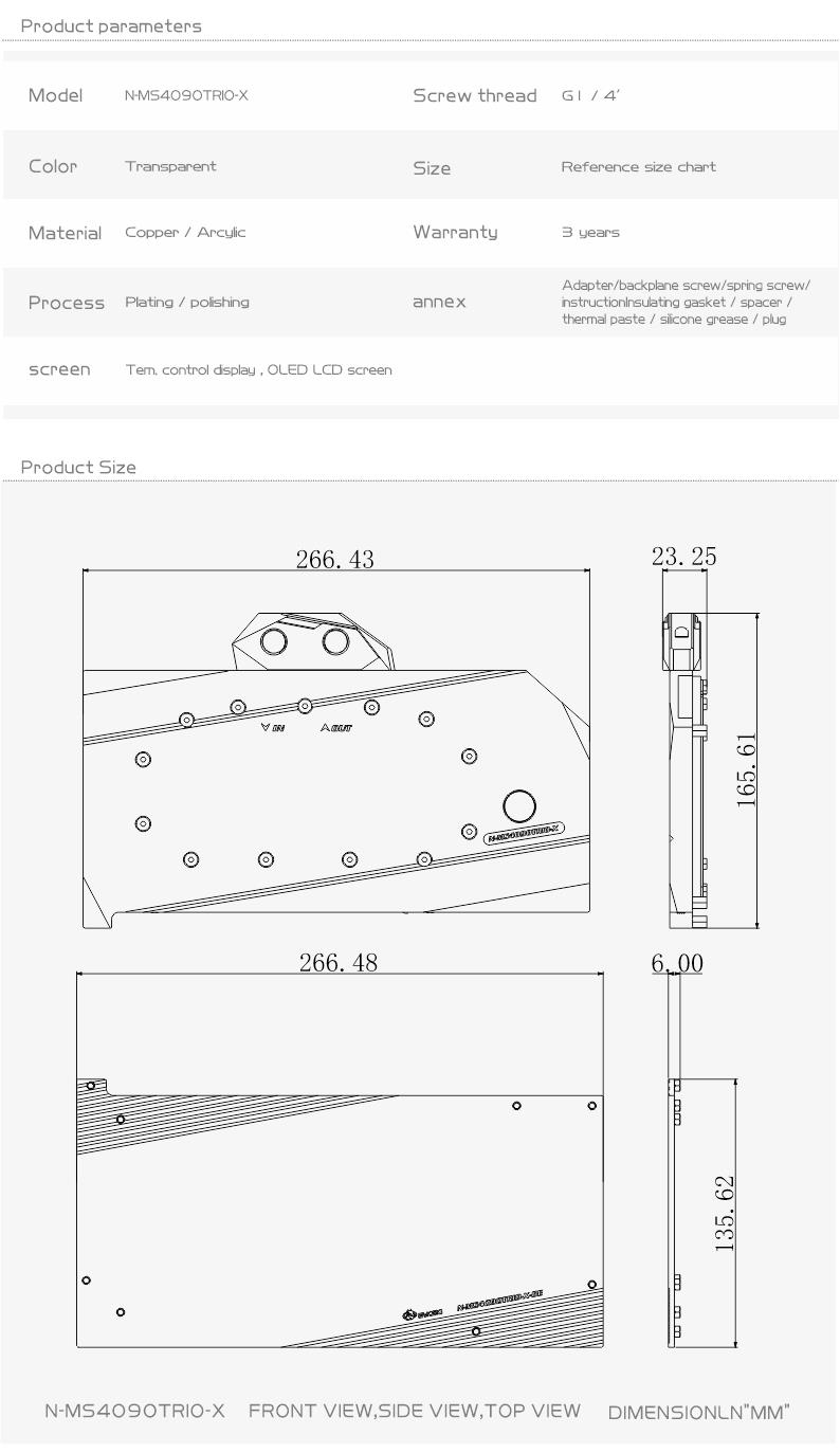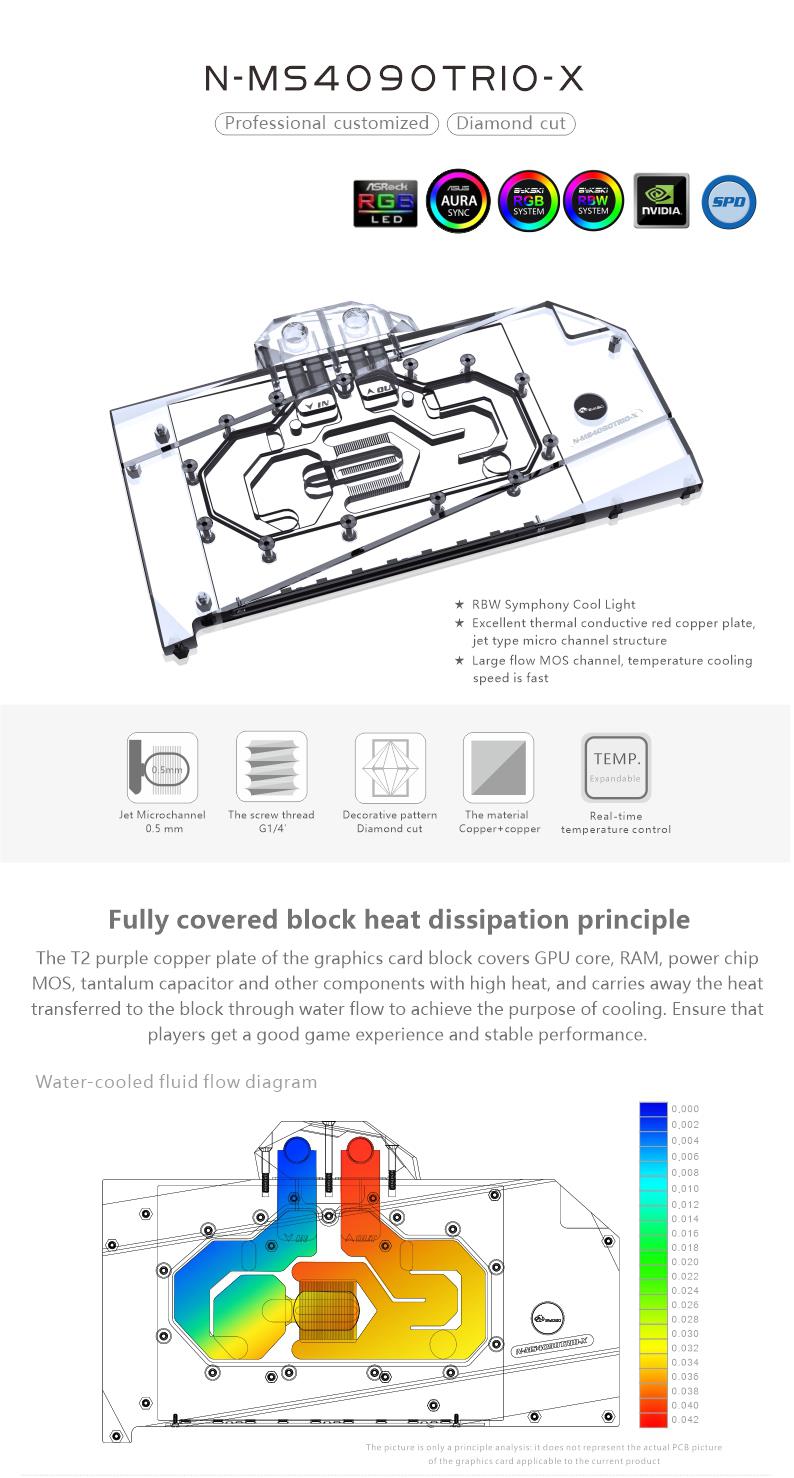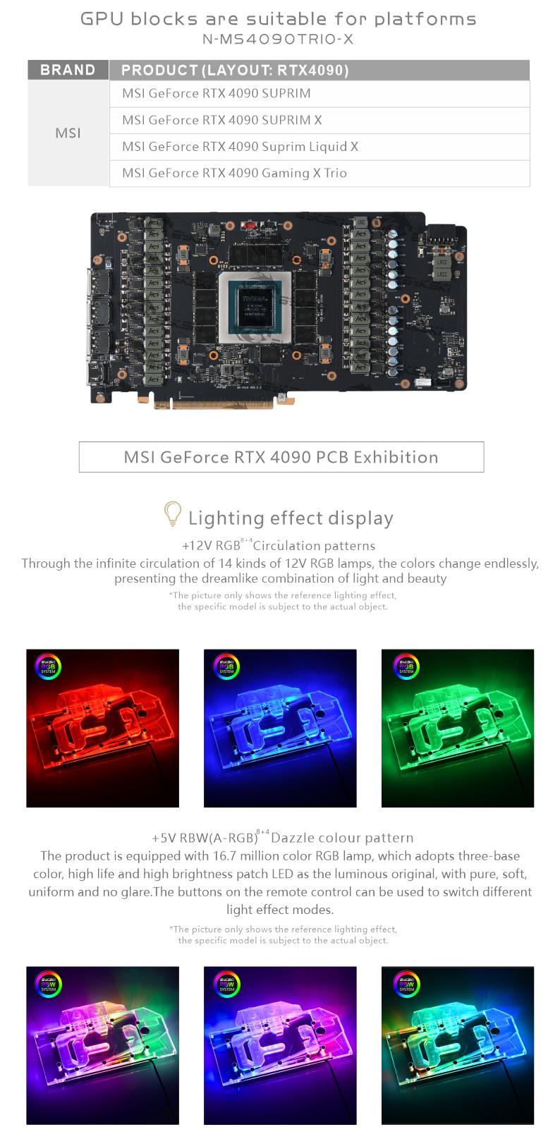 Compatible List (Including but not limited to the following models)MSI RTX4090 GAMING X TrioMSI RTX4090 SUPRIMMSI RTX4090 SUPRIM XMSI RTX4090 SUPRIM Liquid XThe following are some compatible graphics cards and PCB photos, for reference only, if you can not determine the compatibility, please consult us before purchase.