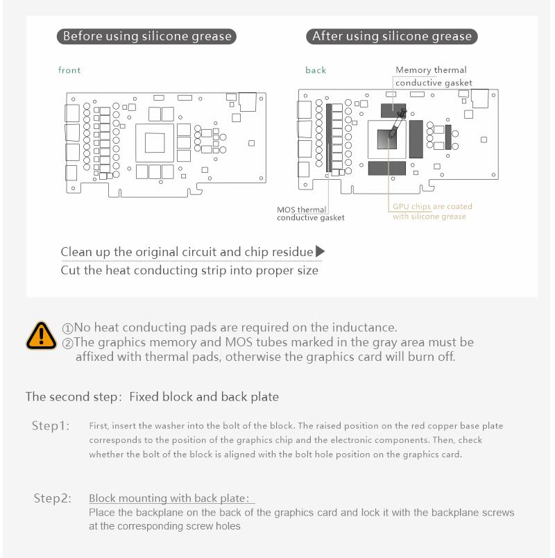Please judge the compatibility according to the PCB shape and the location and quantity of key components (Core / MOS / VRAM / Capacitor / Inductor / Power Socket). If you have any questions, please consult us before purchasing.