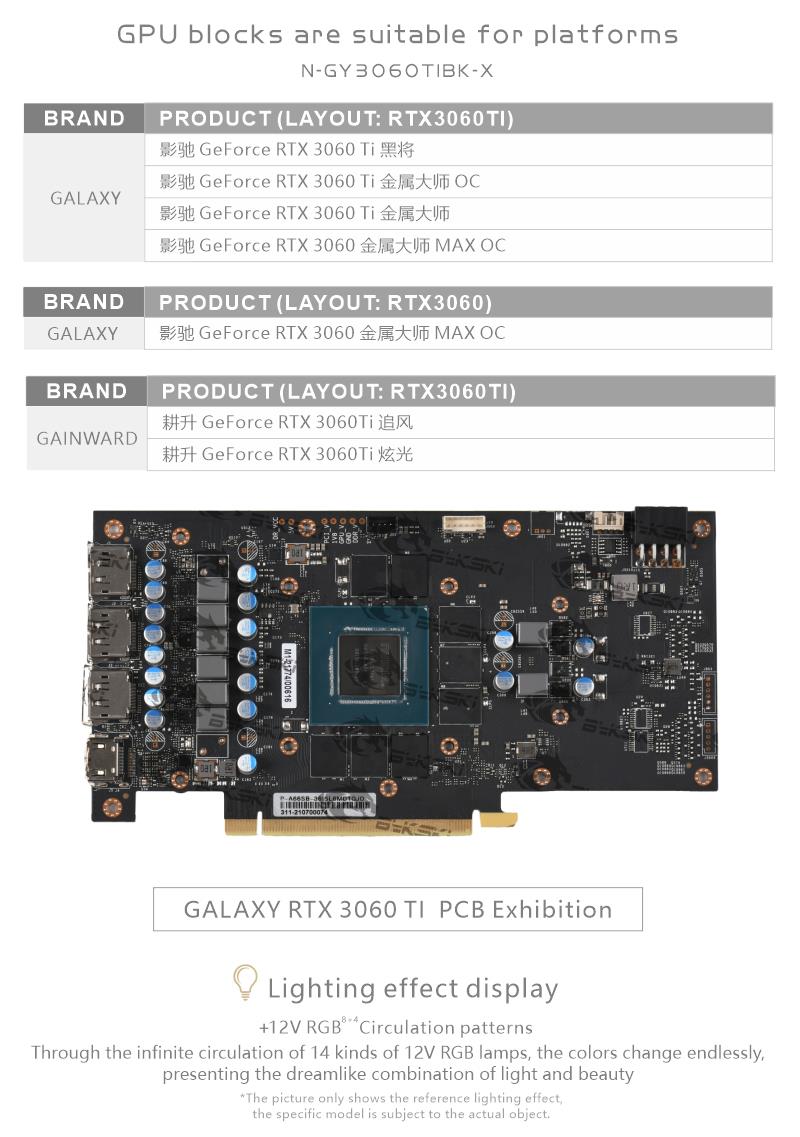 List of graphics cards applicable to the product (including but not limited to the following models. In rare cases, the graphics cards of the listed models may not be applicable due to the upgrade of graphics card PCB).Galax RTX 3060Ti