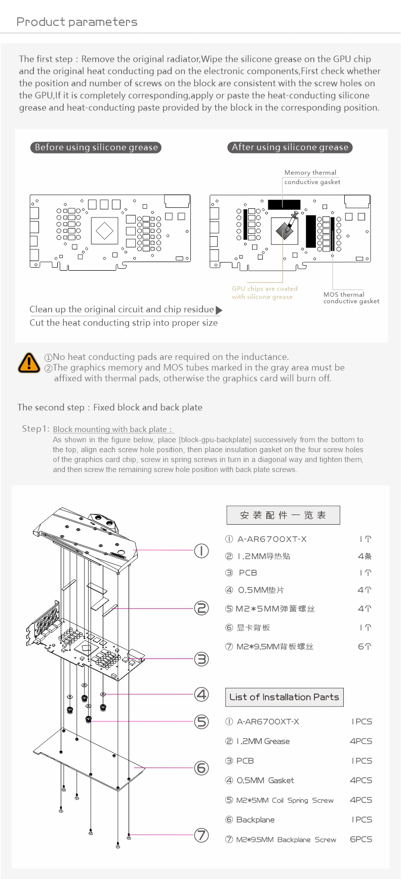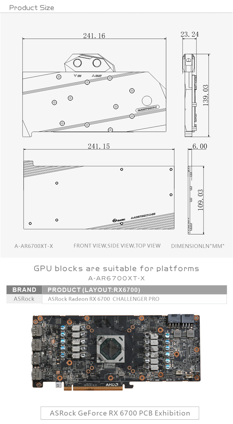 Compatible List (Including but not limited to the following models)ASRock RX6700XT CHALLENGER PROASRock RX6700XT Phantom GamingPlease judge whether the block can be applied to your graphics card according to the PCB, the position of the Core/VRAM/Capacitor/Inductor/Screw hole must be 100% compliant, the number of VRAM/Capacitor/Inductors may vary slightly depending on the card model.