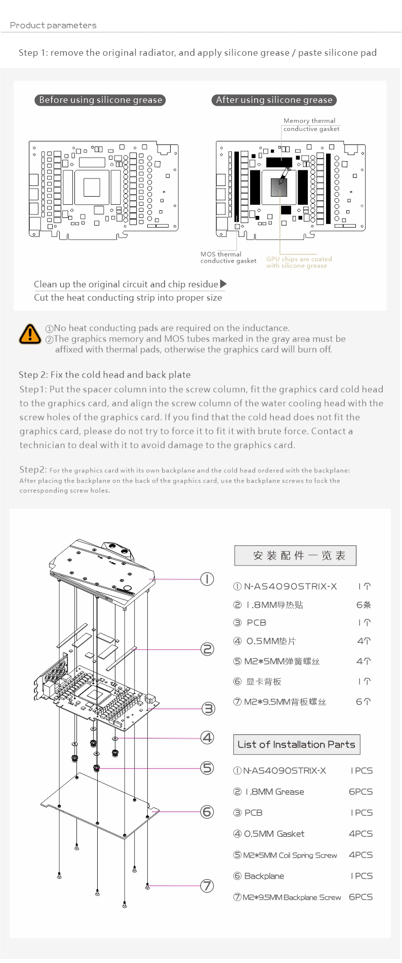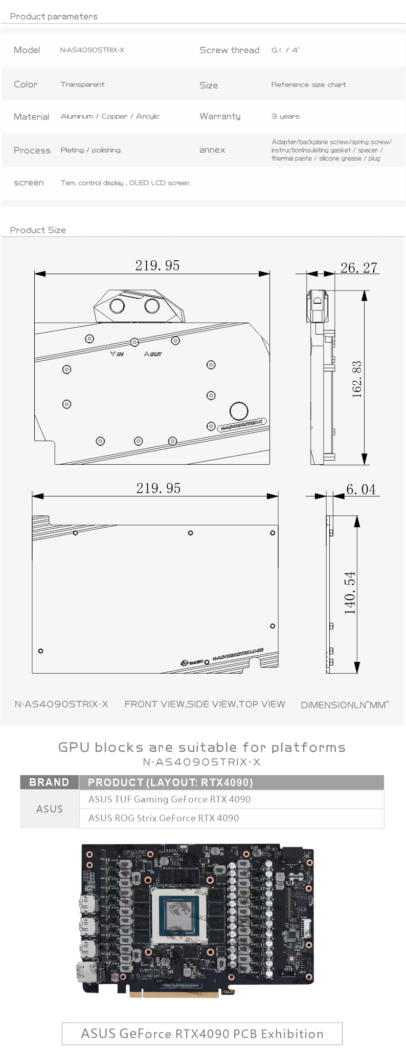Compatible List (Including but not limited to the following models)ASUS TUF GAMING RTX4090ASUS ROG Strix RTX4090The following are some compatible graphics cards and PCB photos, for reference only, if you can not determine the compatibility, please consult us before purchase.