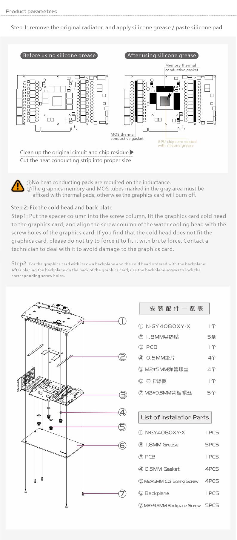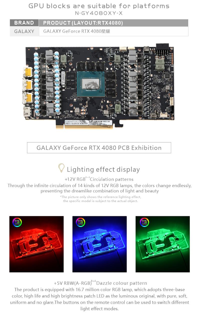 Compatible List (Including but not limited to the following models)Galax RTX 4080 SGPlease judge whether the block can be applied to your graphics card according to the PCB, the position of the Core/VRAM/Capacitor/Inductor/Screw hole must be 100% compliant, the number of VRAM/Capacitor/Inductors may vary slightly depending on the card model.