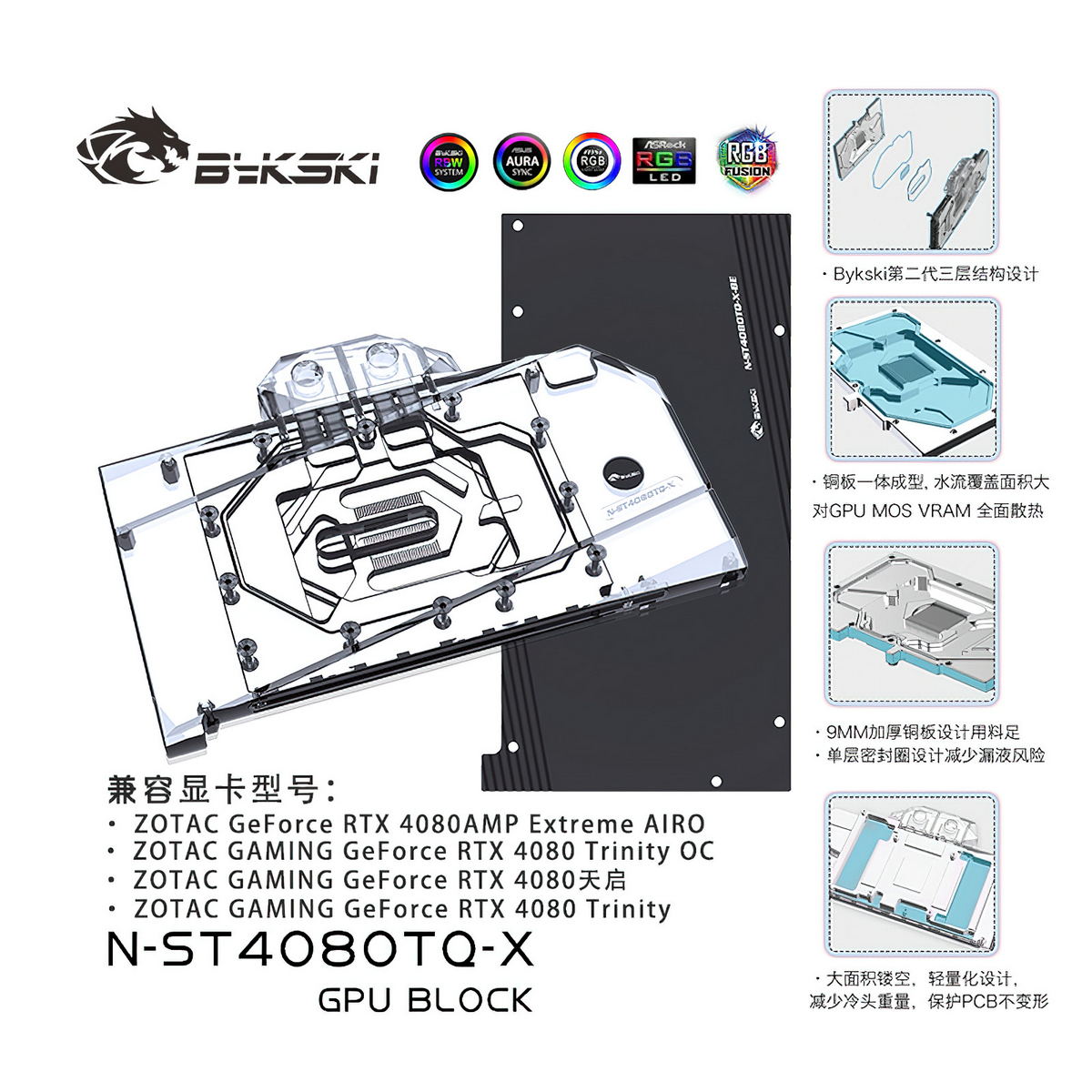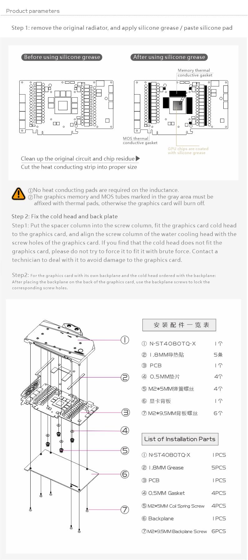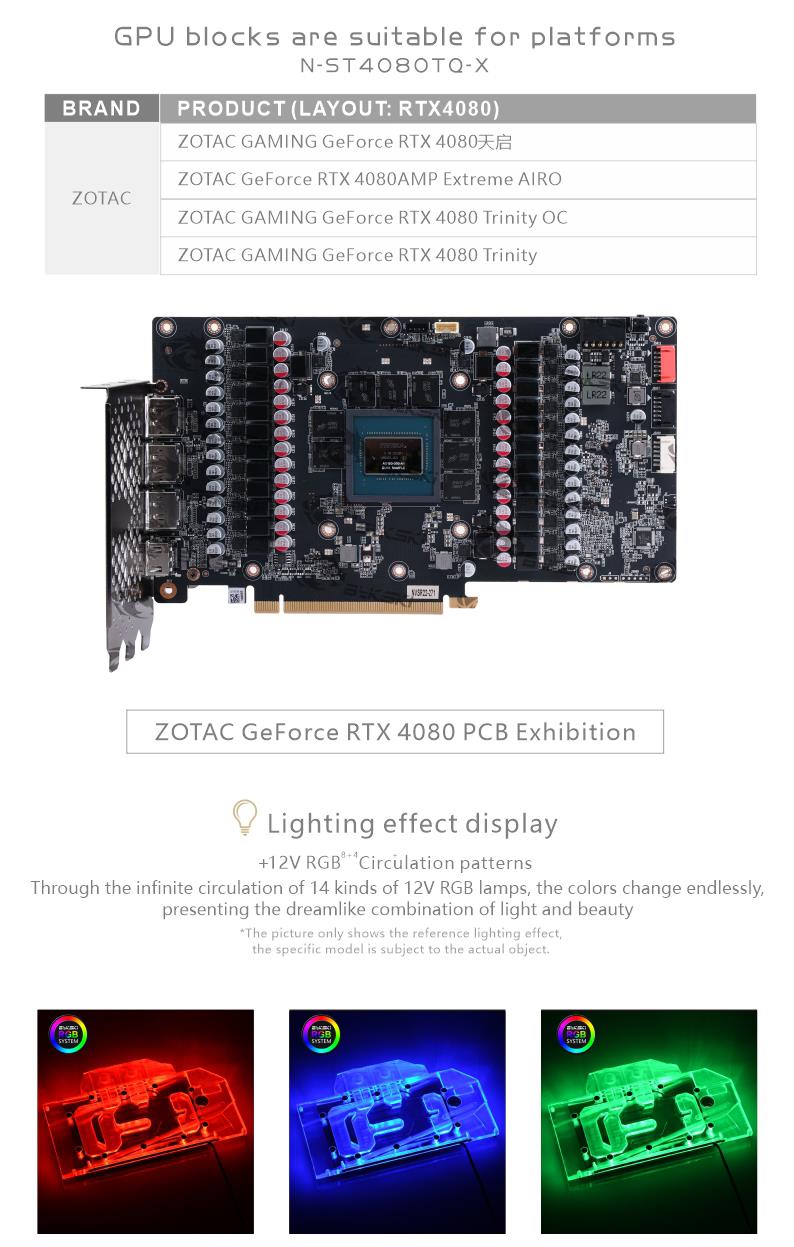 Compatible List (Including but not limited to the following models)ZOTAC RTX4080 TrinityZOTAC RTX4080 Trinity OCZOTAC RTX4080 AMP Extreme AIROPlease judge whether the block can be applied to your graphics card according to the PCB, the position of the Core/VRAM/Capacitor/Inductor/Screw hole must be 100% compliant, the number of VRAM/Capacitor/Inductors may vary slightly depending on the card model.