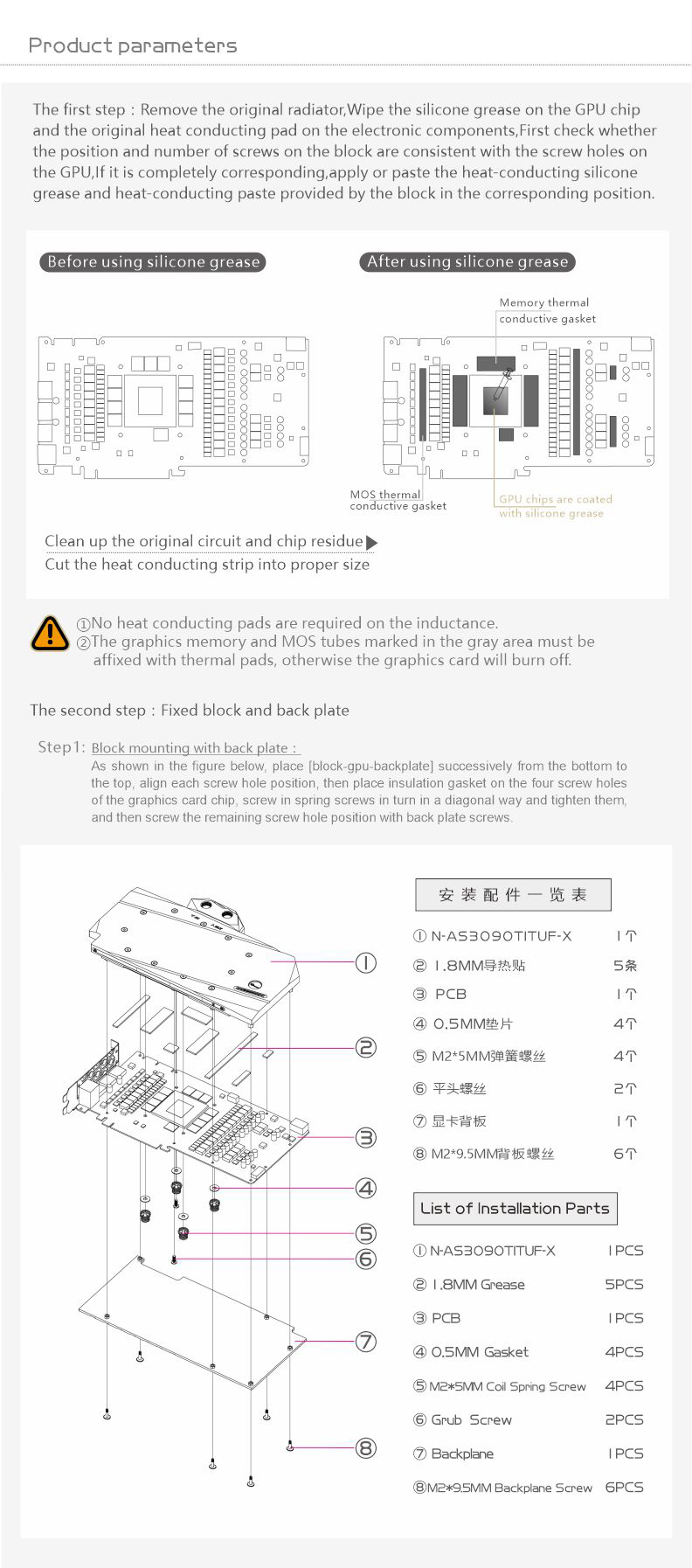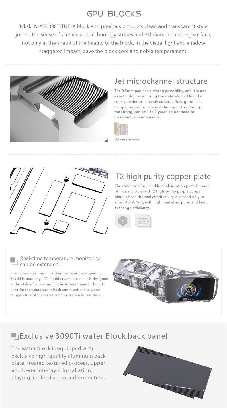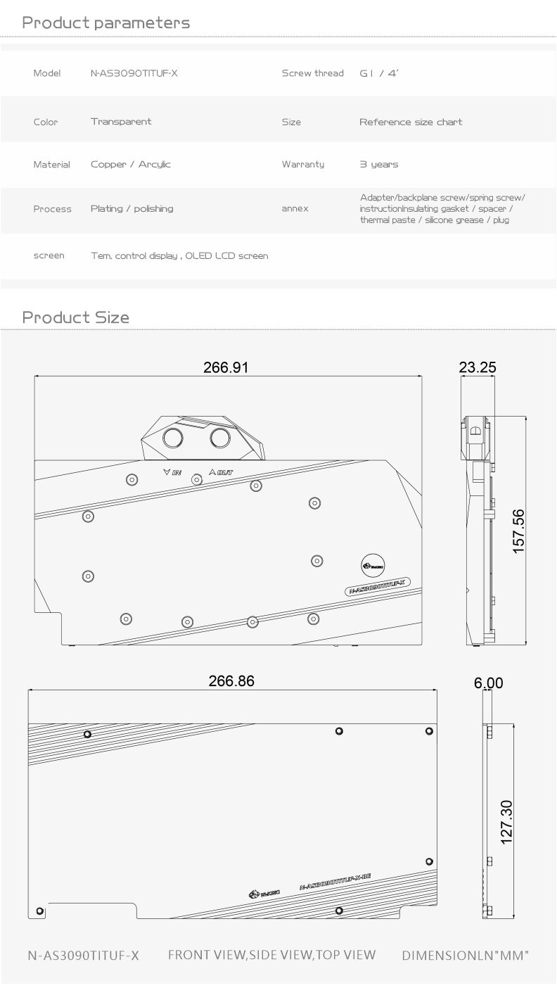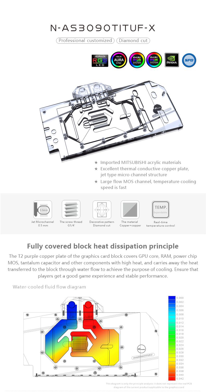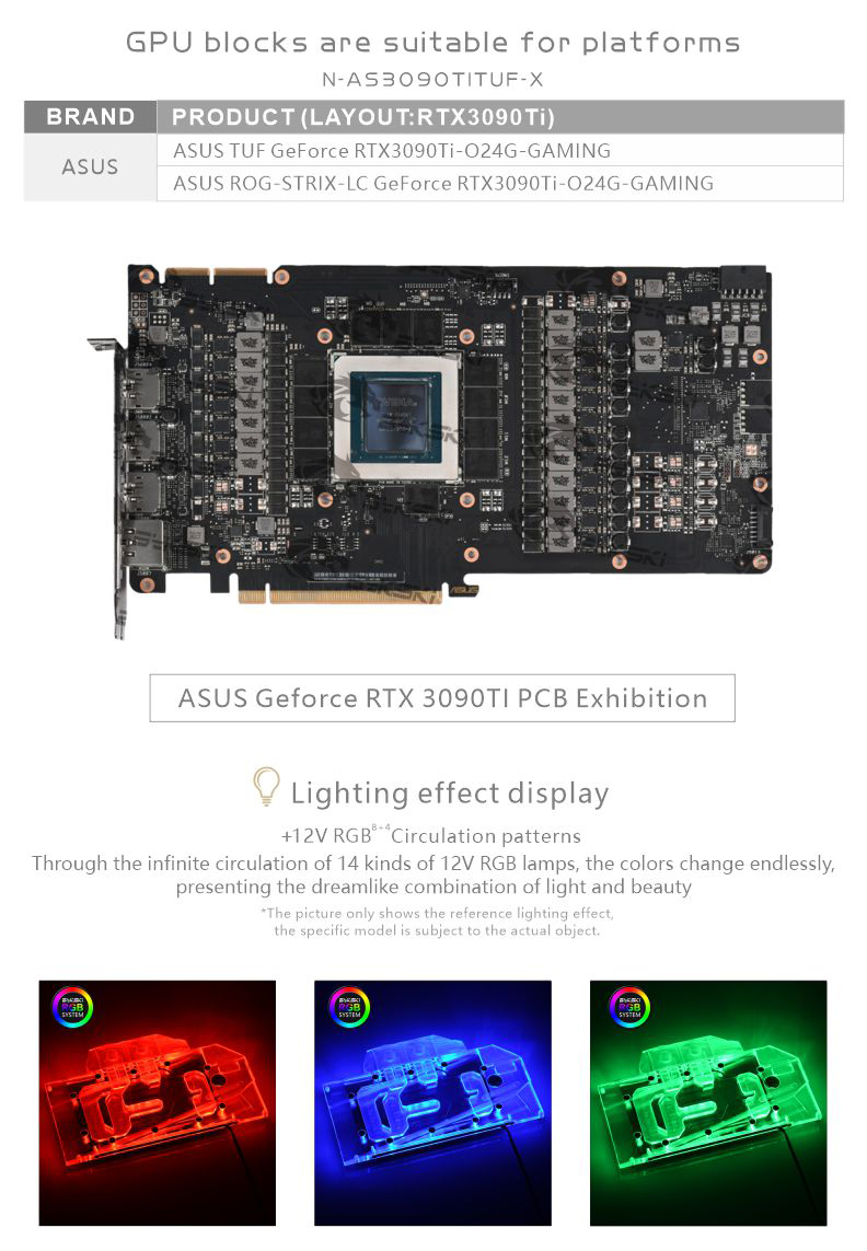 Compatible List (Including but not limited to the following models)ASUS TUF RTX3090TiASUS Rog Strix LC RTX3090Ti O24G GAMINGPlease judge whether the block can be applied to your graphics card according to the PCB, the position of the Core/VRAM/Capacitor/Inductor/Screw hole must be 100% compliant, the number of VRAM/Capacitor/Inductors may vary slightly depending on the card model.